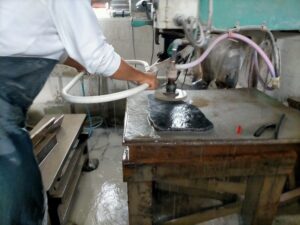 研磨機では水を出しながら研磨していきます。摩擦で熱が発生するため水は必須です。