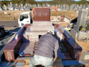岡崎墓園にてデザイン墓石の建立作業をして参りました、中国産G663とインド産の新中国マホガニーの石材を使用しました