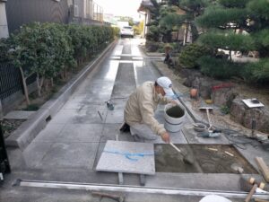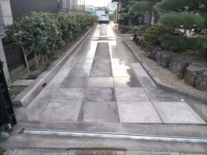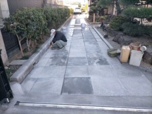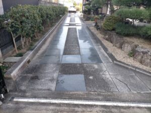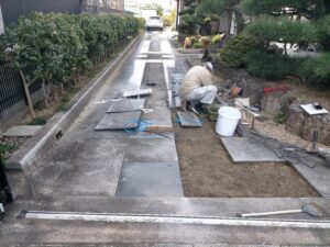 本日はお施主様宅の住宅駐車場通路の板石張り張り替え作業と目地の補修工事をしてきたので