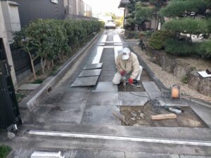 内容としては、板石が割れている、ガタガタする目立つところの修正補強、
