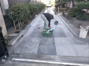 豊田市今町の住宅駐車場にて板石張りの破損した部分の張り直しと目地の入れ直し作業をさせていただきました、補修、建築工事