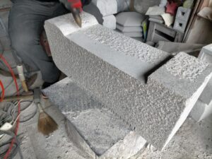 岡崎市夏山石を使用して製作していきます。写真を参考に図面を起こしてその規格サイズに石材をカットします。