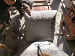 布泉手水鉢の文字彫刻に関して、薄刃で切り込みを入れていき、コンプレッサーノミで突いて成形します。