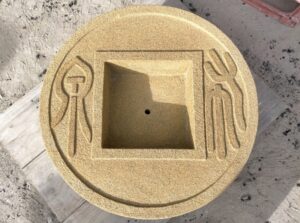角を出すことで文字がはっきりします。中心の窪みは穴掘り機で穴を連結して開けていき、くり抜きます。