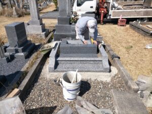 墓石本体の土台である四ツ石を据え付けコーナー金具を装着します。