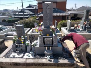 新しいセメントを敷いて、墓誌の土台を水平に据え付けます。下駄、墓誌本体の順に据えて完成です。