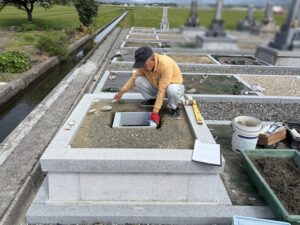 小物は少しだけ墓石本体から離します。コーキングにくっつかないように1日だけ放置して頂きます。